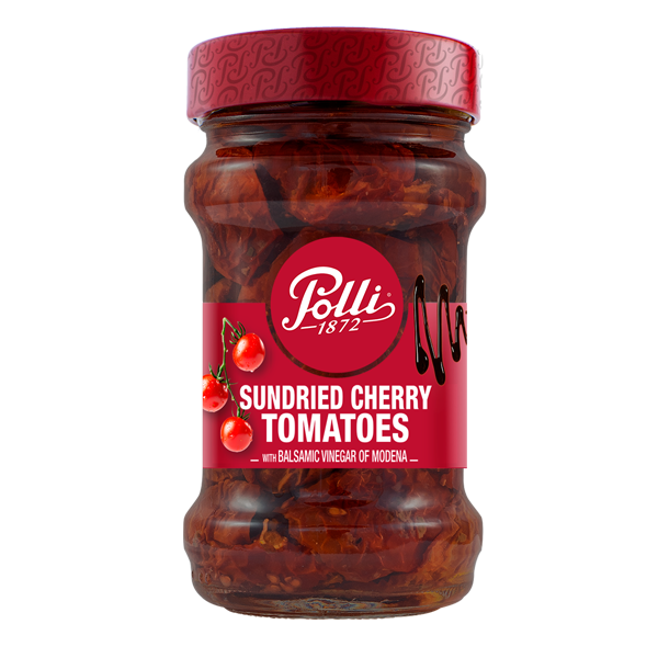 Water, marinated sundried cherry tomatoes 39,3% (sundried cherry tomatoes 22,4%, water), Balsamic Vinegar of Modena 5,5% (wine vinegar, concentrated grape must) (contains SULPHITES), sugar, salt, wine vinegar (contains SULPHITES), parsley, thickeners: xanthan gum, pectin. May contain FISH, CELERY and MUSTARD.